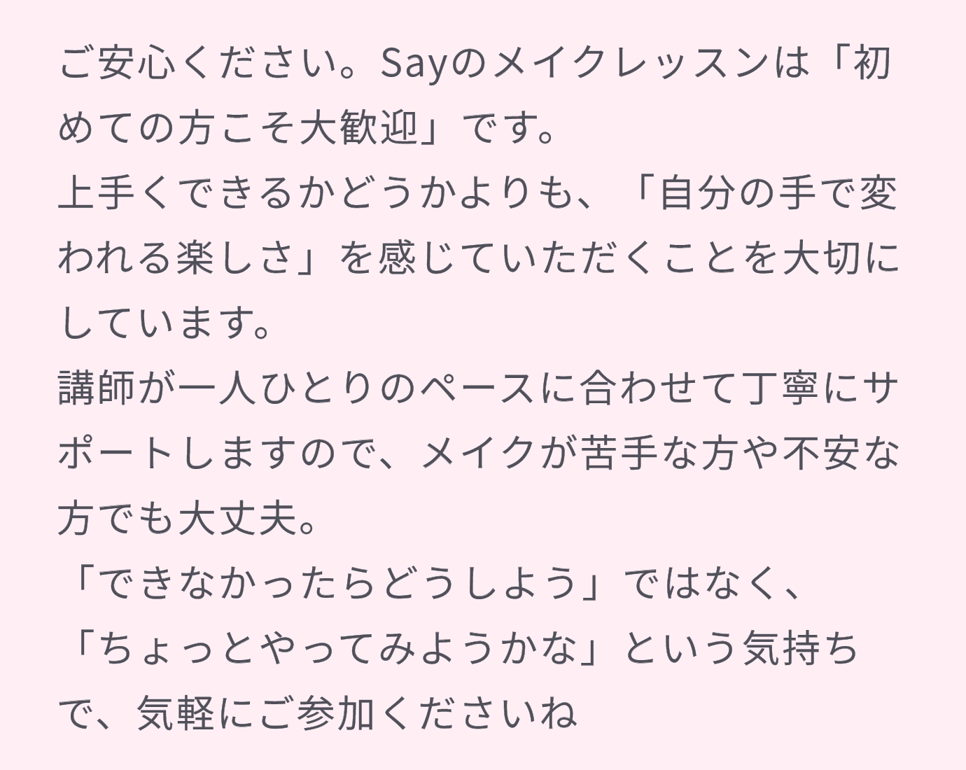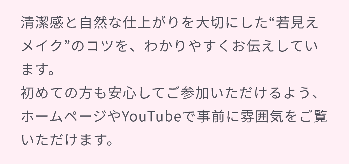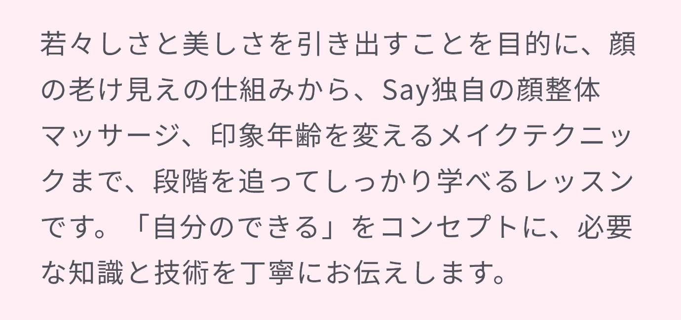 に投稿されました 小松敦子 Trustindex は、レビューの元のソースが Google であることを確認します。 本当に目から鱗でした。20代で覚えたメイクが年を取るにつれて下手くそになったと思いきや、ただただ自分の顔が老化していただけ笑。なぜ大人メイクが必要か、丁寧に親切に教えていただきました。仕事がら人前で話すことも多いので勇気を出して参加して本当に良かったです。先生は皆お綺麗で何より上品にお話しされるので聞いていても信頼できました。お化粧品もお値段も高くなかったです。せっかくの若返りメイクのスキルを体現したくて一式買いました。合計三万しないので、今までドモホルンやディオールが高かったなーと実感しました。教室はリピートもオーケーと伺いましたので、年に一回ぐらい行きたいな! ありがとうございました♪😊 に投稿されました かわせはるみ Trustindex は、レビューの元のソースが Google であることを確認します。 東銀座からすぐ。ビル7Fのメイク教室。明るくて清潔。講師陣の方々が明るくて、キレイな方たちばかり。メイクを習って、私も講師の方々のようになりたいと思いました。 に投稿されました 菅原幸子 Trustindex は、レビューの元のソースが Google であることを確認します。 過去に何度か通っていて今回は久しぶりの個人レッスンでした。 こちらの先生方は皆さんとても親切でわかりやすいと思います。 明日からまた、新鮮な気持ちで鏡に向かえそうです。 に投稿されました カシミア Trustindex は、レビューの元のソースが Google であることを確認します。 マンツーマンで丁寧な指導。不明な点は都度質問。終始和やかな雰囲気で時間が経つのはあっという間でした。これからもお世話になります。 に投稿されました kyoko abe Trustindex は、レビューの元のソースが Google であることを確認します。 2回めの参加でした。改めて肌のツヤが出るマッサージや年齢にあったメイク方法が確認できて良かったです。眉毛もきれいに描いていただいて次回は眉毛レッスンを受けてみようと思います! に投稿されました 佐藤鈴子 Trustindex は、レビューの元のソースが Google であることを確認します。 改めて大人のメイクごできるようになりました に投稿されました FUMI Trustindex は、レビューの元のソースが Google であることを確認します。 しばらくぶりに教室に行きました。今回は感謝デーということできれいにメイクをしていただいたあと写真撮影まで。歳を重ねても内外でハリのある自分でいるために今後もお世話になりたいです。 に投稿されました Yuppi T Trustindex は、レビューの元のソースが Google であることを確認します。 新聞広告でsayを見つけて暫く迷っていたけど、思い切って横浜で開催された教室に参加。それから7〜8年銀座教室に通っています。 2時間のダイジェスト講座は手頃な値段で何回も通えます。 初めて講座を受けた時に眉毛の描き方を習い、目から鱗でした。 講座の後に化粧品の紹介はありますが無理強いはありません。 シンプルなスキンケア用品と講座で習ったマッサージのお陰でシワや弛みが軽減出来ていると思います。 に投稿されました 米澤久子 Trustindex は、レビューの元のソースが Google であることを確認します。 雑誌で見るようなビフォアアフターを体験出来て、楽しかったです。😊 Trustindexによる検証 Trustindex の認証バッジは信頼の普遍的なシンボルです。 過去 12 か月間の顧客レビューに基づいて、4.5 を超える評価を持つ企業のみが認証バッジを取得できます。 もっと読む